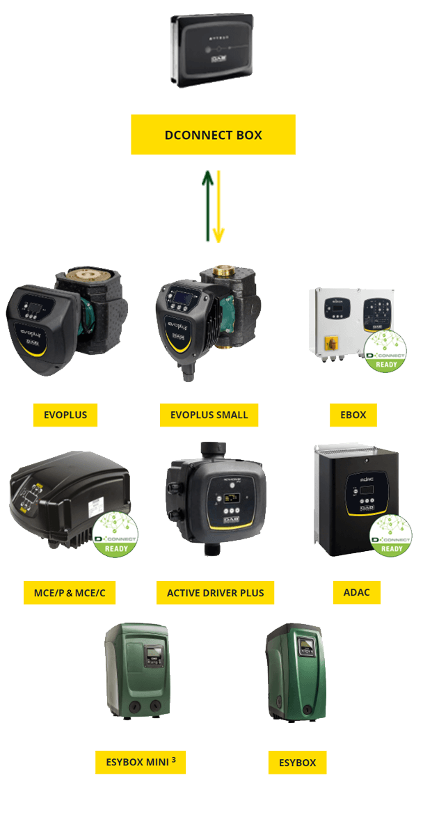 DConnect is the new DAB cloud service that allows you to remotely control your installations, in real time and wherever you are. It is possible to control pressurisation and water management pumps, and heating or air conditioning circulators.
